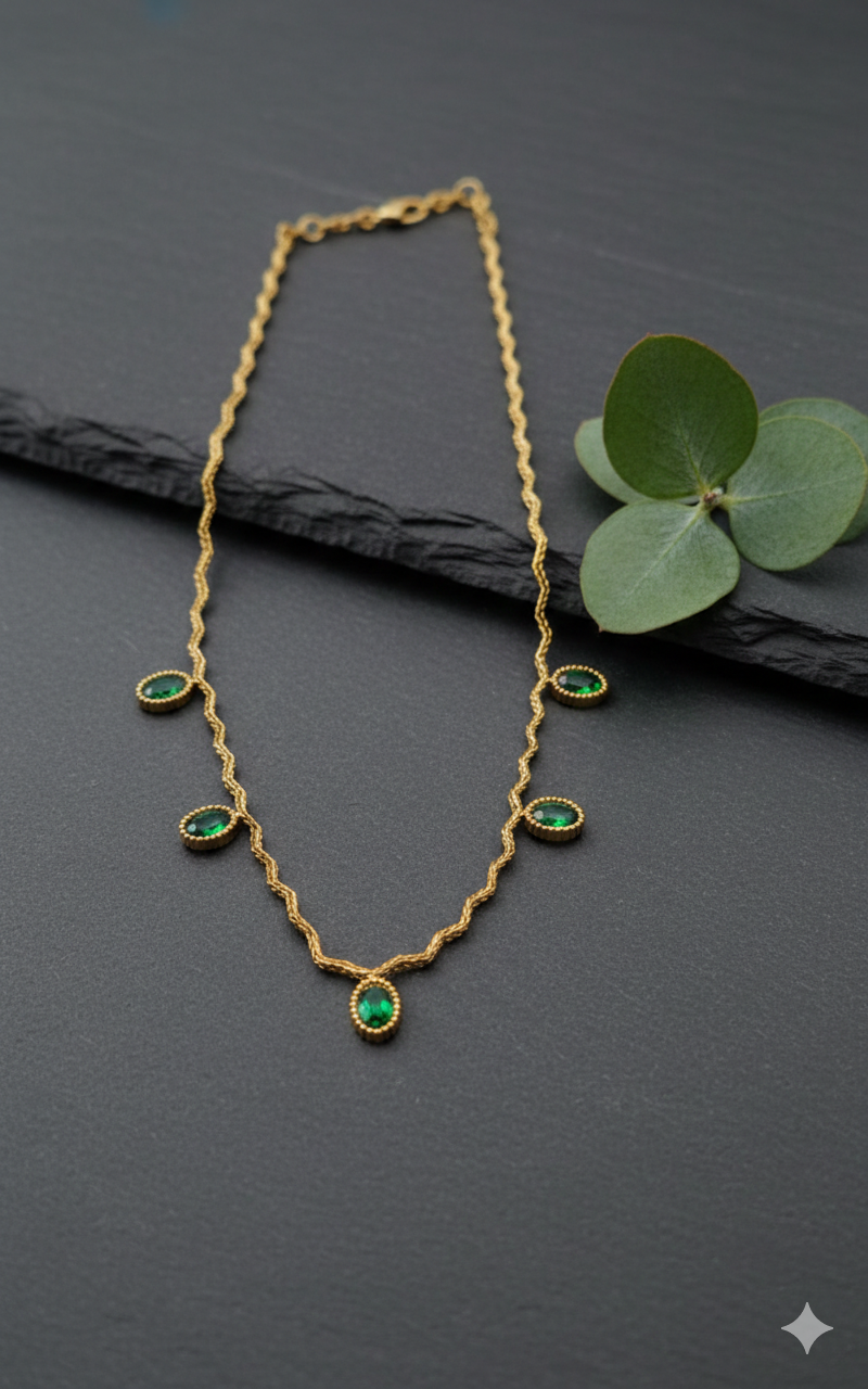 Elevate your everyday elegance with this stunning gold-plated necklace featuring a vibrant green stone centrepiece. Crafted with anti-tarnish technology, this piece maintains its lustrous finish and radiant glow for years to come. The perfect blend of sophistication and durability, it complements both casual and formal occasions.