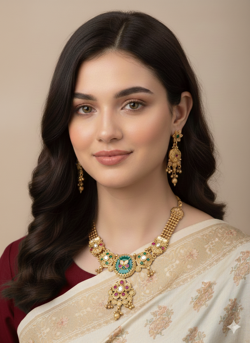 Brass Necklace- Premium Green & Red Stone