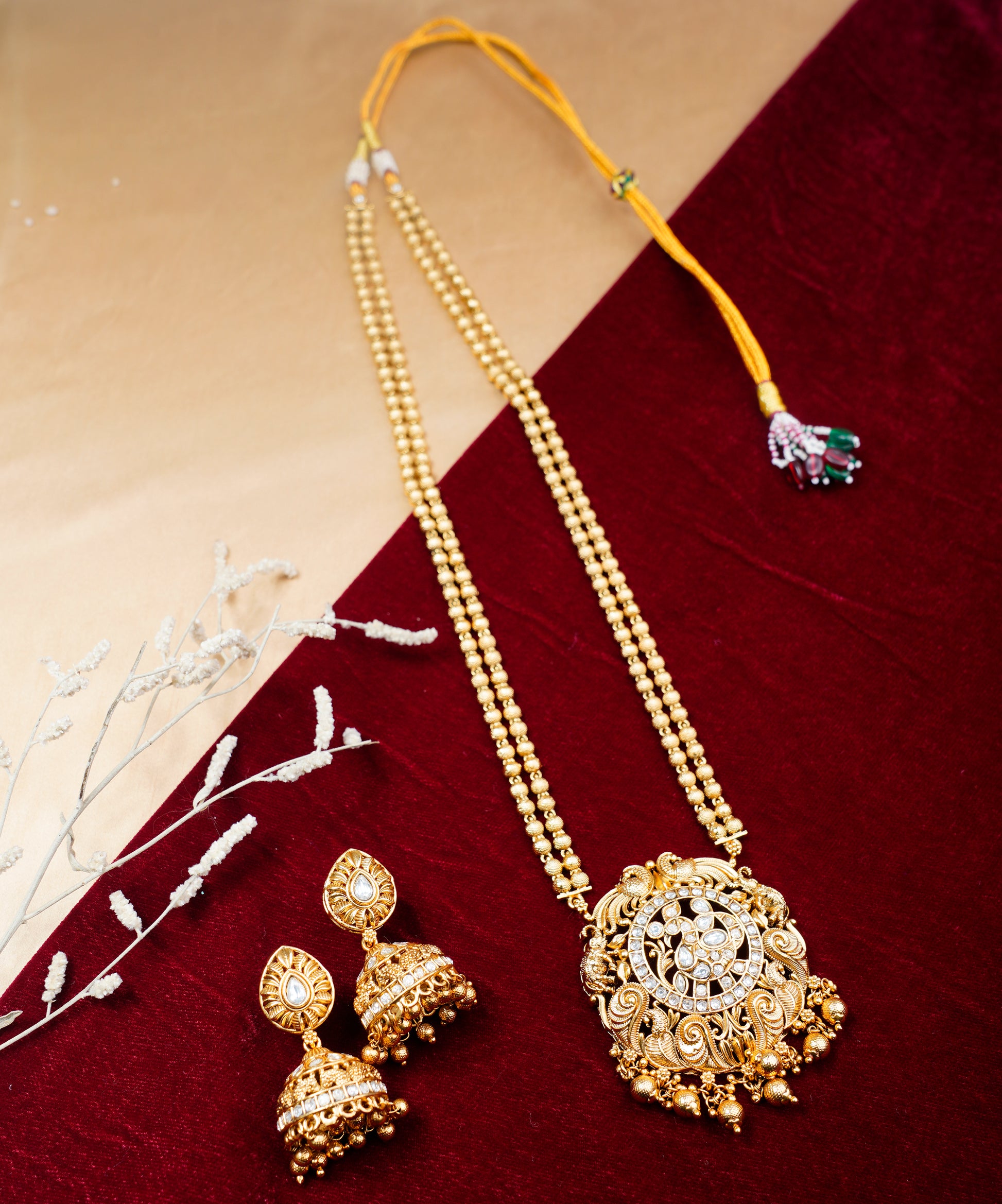 Brass_Gold Plated Paan Leaf Style long Chain Necklace Set