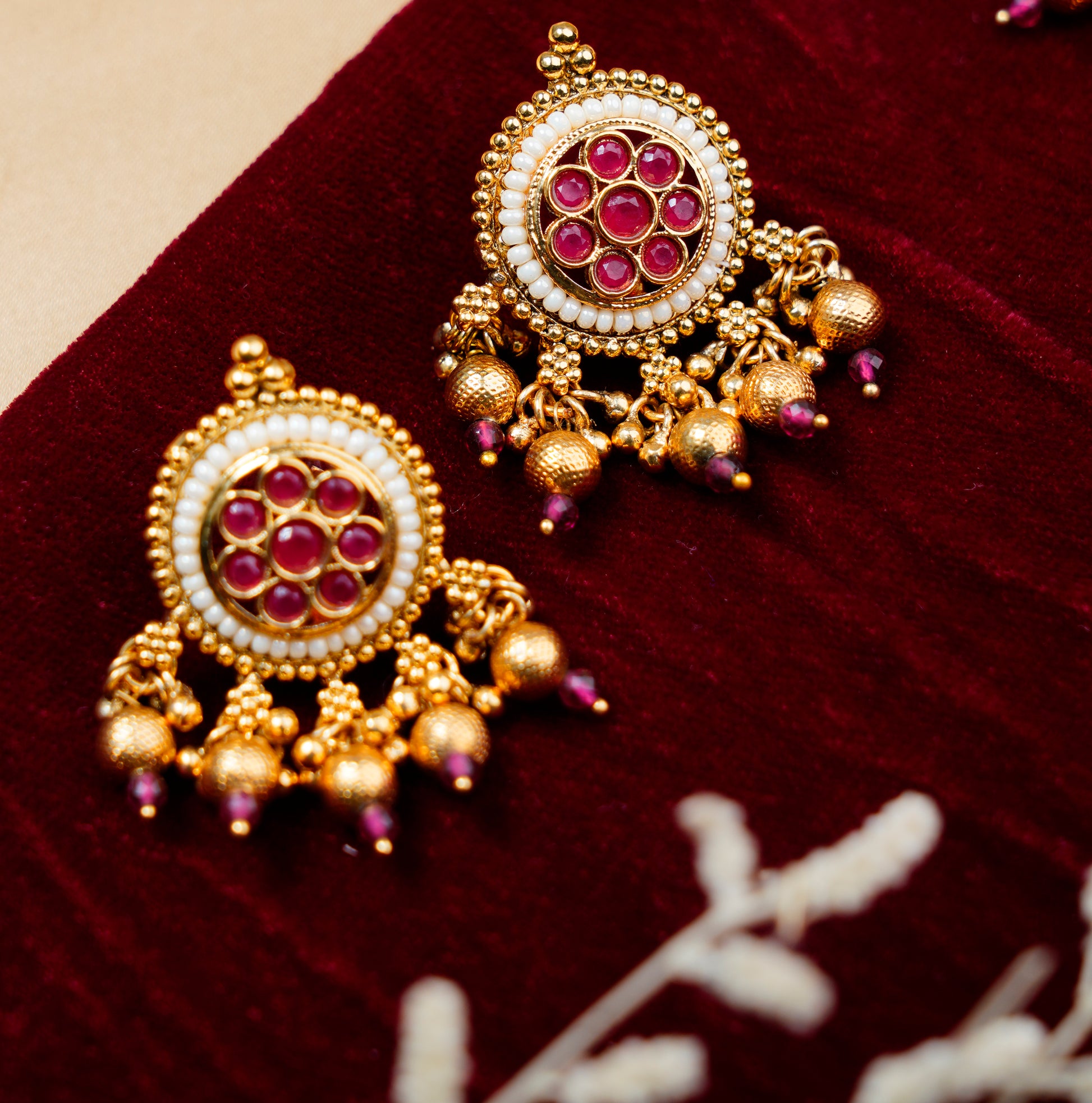 This brass choker set showcases expert craftsmanship with its gold-plated finish and pearl chain detailing. The combination of warm metallic tones and lustrous pearls creates a refined aesthetic suitable for both casual and formal occasions. Built on a durable brass base, the gold plating ensures lasting shine and resistance to tarnishing. The choker's adjustable design accommodates various neck sizes, while the pearl chain accent adds visual interest and sophistication.