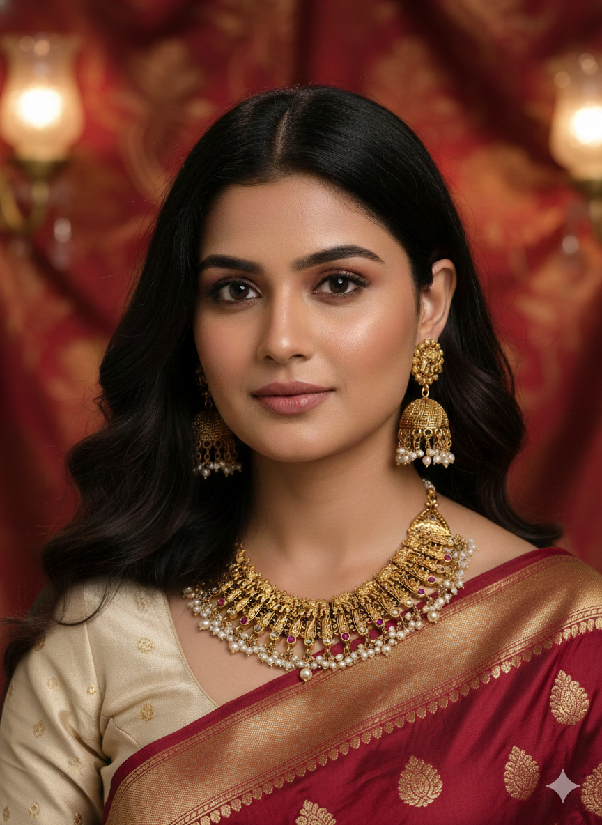 Crafted from premium brass, this temple jewellery piece showcases an exquisite elephant motif—a symbol of wisdom and prosperity in traditional Indian culture. The intricate detailing captures the majestic form with refined artistry, making it an ideal accessory for festive occasions, religious ceremonies, or everyday wear. The durable brass construction ensures longevity while maintaining its lustrous finish. Perfect for those seeking authentic temple jewellery that blends cultural significance with timeless elegance.